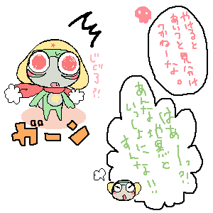 あとは修正?あったらやって・・・って感じ!! 実は、ペーパーは暁さんと一緒に作らせていただきました・・・vvv(ゆっちゃったw) なんで、一番豪華なものになってると思われます!!ww 是非ペーパーだけでももらったあげてくださいね・・・vvvv 明日は遅くなりそうなので、今日のうちに、何持ってくか書いておこうとおもいます。 お品書き 漫画↓(内容はOFFページに載ってます。) ・『はじめてのおうち』(新刊) ・『ぼくとおともだち』 ・『みみぱん×セブロ』 ・『おにいちゃまといっしょ』 グッズ↓ ・ケロロ小隊&ガルル小隊メモ帳 ・ラミカ(冬樹くんのだけなくなってしまいました;) ・シール(6枚の大小入り※プルルセットだけ8枚セットw) ケロ・ギロ・ゼロセット/クル・タマ・ガルセット/Dケロ・シヴァ・ドルセット/プル・タル・トロ・ゾルセット ・・・て感じです! ラミカとか絵が古くて、もう結構見るの辛い感じなんだけど・・wあるので持ってきます!w なんか、Dケロ小隊のグッズ作りたくなってきた・・・今からいける・・・?便箋とかww(いらねwとかゆわないw) 無理かな・・w てか、そんなに置けないかww つーか明後日か・・・;;やばい~~~;;鼓動が激しくなってきたお・・・・(´д`;)ハフンハフン