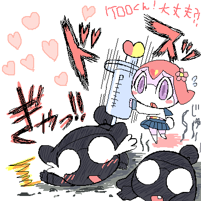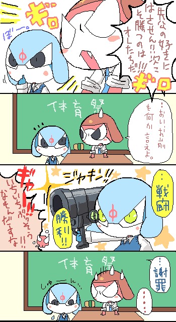 完成・・w ぺんたぶくんの機嫌がちょっとなおったからその隙に仕上げた!!w こいつの機嫌うかがいながら絵描くなんてやだ・・・!!!!(`Д´) 明日絶対電話する・・;; ムダに委員会とか考えるのとか楽しい・・・ww ギロロくんとドルルくんは体育委員かな? ギロロくんはめっちゃ熱そうww朝練とか出ないと怒りそうww ドルルくんはやる気あるのかないのかさっぱりわかりませんww 体育祭とか・・なんか、クラスがいっぱいあるイメージが沸かなくて・・w なんかみんな同じクラスな気がするww1クラス・・?!www過疎w わかんないけどw生徒VS先生でいいんじゃないかと・・w 生徒は毎年こてんぱんにやられますw先生達強いvvv ドルルくんの武器はいつも転送で出してる・・・っつーことでww てゆうか武器が描けないよ・・;;