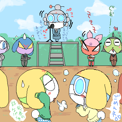 やたら時間かけてしまった・・;; 背景を描くとすごい悩むので時間かかる・・・てかこんなの背景とは言えない感じですがwwwwかけねーよ!!w 校長先生ゼロロママww理事長?とかでもいいかとオモッタw・・てかどうちがうのかわからんけどww 校長先生の話ってなんで長いって印象あるんだろう・・実際長かったかな? 生徒と共に寝てしまうベテラン教師ギロ父ケロ父に焦るガルル先生w ウレレさんはじめて描いたのに半分とかwひどい仕打ち! ゼロロママが校長ならすごい平和そうな学園生活おくれそうvvvv 校長せんせーだけど音楽の授業とかやってほしいなvvvすごい良い声で歌ってくれそうvvvw ゼロロは校長の息子だから生徒たちに色々むちゃな校則の要求されて困ってるとかわいいvvw ケロロくん制服の上からジャージとか着そうだなwって思って着せてみたvv ケロちゃんはジャージほんと似会うvvw アニケロも見た!私感想書くの下手なので箇条書きで書いてみようとおもうw ・とおるさんにときめいてるなっちがすげーかわいいvvv ・たまたんのしゃべり方がむちゃかわvvあんな図体なのにかわいかったw ・クルちゃんもかわいいv ・てかこれなんのパロ?ww ・ええwwwwwwwまさかのいけめんウェトルキングwwwww ・ケロちゃんたちが普通に悪役でかわいいwww主役なのにww ・ニョロロてかわいいよねvvvすきですvw ・ニョロットルキングきめえー!!ww胸あたりからでてる足?ぽいのとかw ・やばーい!おたまたままーーvvvvかわー!!!vvばぶっちょよv?とかゆってんのとかやばいww ・・・て感じw そして、夏コミの合否が出たらしいのですが・・・落選したらしいですww ウワァァ-----。゚(゚´Д`゚)゚。-----ン!!!! 一度は夏コミにサークル参加してみたかったのに。。。;; これでオンリーの方もおちてたら・・・www漫画描いたところで売るとこないwwwってゆう状況にww 今のところイベント予定が、オンリーだけだから・・・・・新刊作った所で・・在庫絶対残るwww困ったw 夏コミ・・・出たかった・・・www 今日はおねーちゃんとゆうと(甥)とそのお友達たちが店にごはん食べにきたvvv しかし写真とかめっちゃとられてすごいはずかしかったwww 仕事終わってから合流したんだが、私こどもにもてもてでうけたww 子供はおねえさんがスキらしい。 3人いたんだけど、みんななぜか私と手をつなぎたがって、でも私の手は2個しかないので申し訳ない気分になりました・・;; なんか、自分ガルルさんみたいだったwww しかしみんなかわいいvvv女の子も男の子もかわいいvvvvこどもかわいいvvvvv やはり帰り際になると、ゆうとのテンションがガタ落ちになるのがうけるw 何歳くらいまでこうやって別れを惜しんでくれるのかな~w つづきでパチレスです!!vvvvコメなしもいつもありがとうございます!!vv