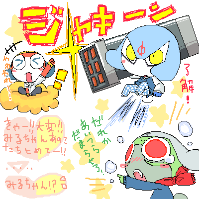 更新![]() picにメモ絵追加 ![]() コメント日記のコピペにしたら長くなってしまったwwなんかくどいなぁ・・まぁいいや・・ www絵がひどいwwww 妄想をうまく絵に表せませんwwww 普段おとなしいけど、行動が過激なドルルくんがかわいいvvvw そんでもってDケロ小隊のみんなは、なんだかんだでダークちゃんにみんな甘いのとかいいなvv ダークちゃんのためにみんな結構なんでもやってくれるvvw ↑上のダークちゃんはただ軽い気持ちでゆっただけなんだけど、ドルルくんが了解しちゃったww ミルルちゃん、いい子なのにダークちゃんには逆らわない感じするwww この絵、ケロちゃんの物まねの続きでいい気がするwww だから相手はケロちゃんとタマちゃんwww黒焦げ必須ww シヴァは寝返りましたwwwおもしろがってるのでドルルくん止めたりはしないw 今日電車でいろいろ妄想してムフフ・・vvてしてたのにw(きもいw)メモっとかないとわすれんね!; すげぇw学園ネタつきないww 追記でメール返信・・・?;