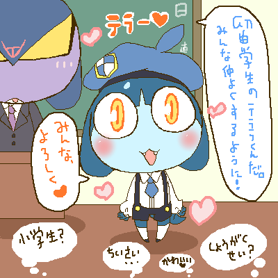 学園登場のテララくんvv 留学生だよね、絶対wでも、フランス・・・??ペコポンのフランスの留学生??w なんか、テララくんはちいさいイメージ。絵はガルルさん描いちゃったんであんまりちいさくみえないがww てか、学園、中学生設定だけど、テララくんは絶対中学生じゃない気がするww小学生?w でも小学生だと学園登場できないから小学生にみえる中学生ってことでww(むりやり) そして長ズボンがとても似合わなかったので・・・w半ズボンwやっぱ小学生w かわいいから女の子に可愛がられそうvv ケロちゃんシララくん嫉妬ww てゆうか・・・ちょっと待てよ・・・テララって・・・男の子?女の子?? かってに男の子だと思ってるんだけど・・・どっちだろ?! まぁ、女の子だったとしても、女の子だったの?!みたいな感じで・・・w(適当ww) 自分的にはテララはテララくんの方が良いなぁvv