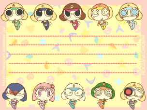 とりあえず幼年期本の表紙はだいたい出来てますw 合同本がやばいので、やりますwwイマからww しかもページの都合上、もしかしたら合同本のネタを幼年期の方に番外編で入れてページ増やさなきゃかも 描くページがどんどん増えてく・・wマンガ苦手なのにどうしたらいいの....φ(・ω・` ;;) 先週の日曜の癒しを見ないまま次の日曜になってしまった ![]() さっき素顔が見たい声優ランキングみたいな番組やってて1位が気になってずっと見ちゃったよww ちなみに新しいドラちゃんが1位ですごい若々しい女の人でびっくりしちゃった!わさびさん? ケロちゃんもランクインされてたけど取材NGだって くぅさま、うつくしすだから出ればいいのにぃ(´・ω・`)でもボクも声優さんだったら素顔とか出したくないな~やっぱイメージがw 平野綾ちゃんみたいにかわゆかった断然でまくるけどさw とりあえずパチレス遅くなってほんとすいません・・・ ![]() パチレス (反転してお読みください )>9月16日『これからもガンバッテください』 コメントありがとうございます ![]() 一言でもいただけるととっても励みになってます・・![]() ![]() これからももっとケロンさんたちかわいくけけるよう精進していきたいです・・w >9月17日『めそめそさんは、ホムペを作るのにどんなソフト~』 こんにちは 私はホームページビルダーてゆうソフトを使ってサイト作ってます![]() だからところどころおかしいことになってるかもしれません ![]() 見づらかったらスイマセン![]() タグはそんなに詳しくないので横着しちゃってますwコメントありがとうございました ![]() >9月19日『ちびケロバスかわいー!!私も~』 きゃ~ (〃▽〃) うれしいコメントありがとうございます・・![]() ![]() やっぱケロンさんたちはちいさいからバス自体も普通より小さいんだろうな~とかオモウととても萌えますwww ![]() チロカラちゃんにもコメントいただけて・・・ ![]() 感激・・![]() ![]() あぁ・・・描いてよかったです・・・ ![]() wwありがとうございました![]() ![]()