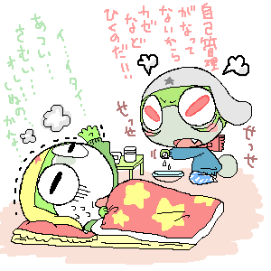 いいかげんTOP絵変えたくて考えながら描いてたんだけどやっぱボツにして、たるるんだけ保存しようとおもったら消えた・・・(^ω^♯) 悔しいから思い出してもういちど描いた!こんじょー、こんじょー!! いやぁ・・・vv昨日ちょーかわいいたるるん見せてもらってから触発されてしまいまして・・vvv たるるんかわいいっすよね・・・vvv 多分すごいスナオな頑張りやさんで良いコだと思ってるんですよね、わたし・・・vv さわやかスポーツ少年的なポジションだよね・・vvさわやか・・・というより熱血かもだけどvw 先生のゆうこととかも、ウッス!!ってすごいスナオに聞きそうと思うvv タマちゃんにそそのかされるとちょっと悪いコになりそうだけどね!w それにしてもシララくんと同じタイプの口してるのになぜかたるるんは間抜けにみえないのはナゼでしょうね?w シララくんあの口でおめめもまんまるで耳元にボリュームがないせいですかね? わたしなんでかしらないけどシララくんすごい贔屓にしてますね・・・vvvかわいいんですもん・・・vvv大好きvvv あんなツラで、ちょっと卑怯そうでイヤミとかいいそうな感じがたまらないですね~^^ それでいて弱そうな感じとかね! 大人になったらシュララさまの声になるのかって話をしてたんですけどwwwwwしぶっ!!!wwww 多分あのお面?をつけたらあの声になるのかな~?それっぽいですよねww シララくんがあの声に成長するとは思えないwwwでもそれはそれでおもしろいので良いvvvww タルルくんの話に戻りますが、はじめて出てきた時は全然スキになれなくて、むしろキライでした・・たるるん・・・ 語尾のッスとか気に食わなかったwwFF10のティーダみたいと思って・・・ 今はナゼこんないとしいんでしょうかvvv ホントなんで最初キライだったのか意味わかんない クルちゃんも初めて見たときキライでしたねぇ~きもちわる~って思ったwwwひどいww 今じゃこんなにいとおしくてたまらんのにね・・・!!ほんと不思議~ もう・・・みんなかわいいですvvvvこんなにみんな愛せるのすごいと思うvvvww ケロロ、語りだすととまらんですねぇ~・・・(^ω^;) 自重してもう終ろうと思います^^;